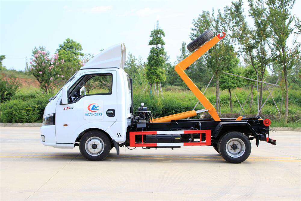 該款鉤臂式垃圾車由液壓系統、操作系統組成。舉升油制缸(1支)系國內知名液壓件廠家生產的雙作用油缸。垃圾廂可自吊上放下,可自行傾倒垃圾,上下一次工作循環時間≤50S。該車的特點是一個車能配多個垃圾廂,能實現一臺車與多個垃圾廂聯合作業,循環運輸,充分提高了車輛的運輸能力。