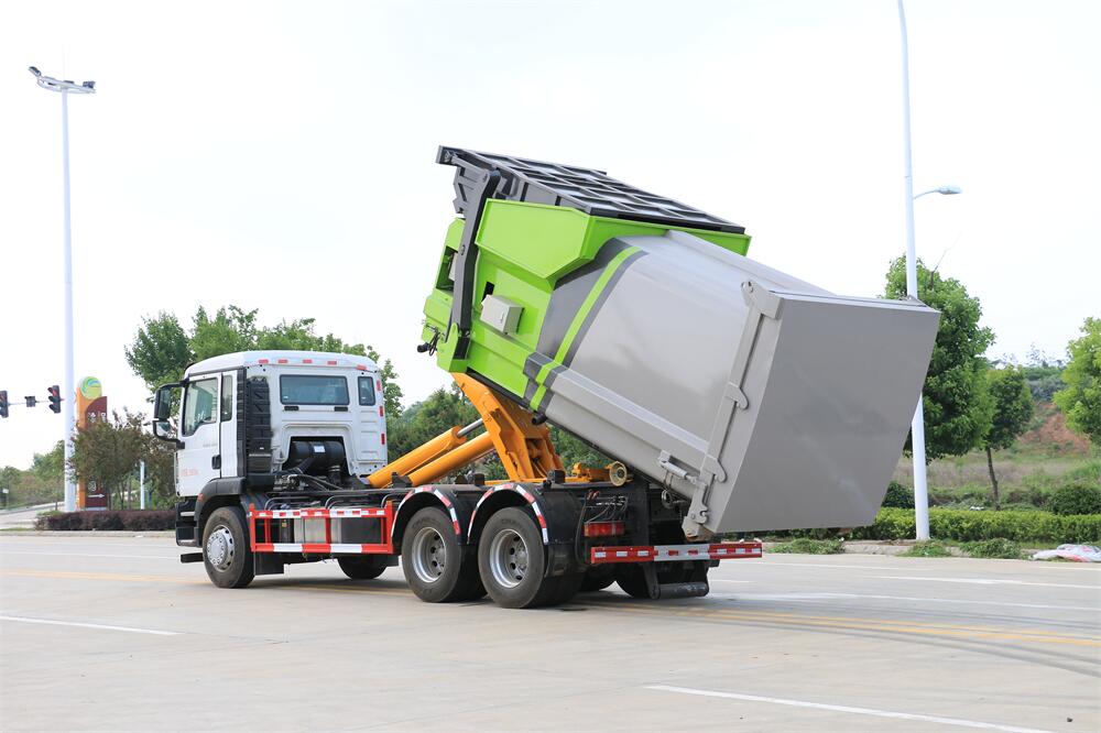 該款鉤臂式垃圾車由液壓系統、操作系統組成。舉升油制缸(1支)系國內知名液壓件廠家生產的雙作用油缸。垃圾廂可自吊上放下,可自行傾倒垃圾,上下一次工作循環時間≤50S。該車的特點是一個車能配多個垃圾廂,能實現一臺車與多個垃圾廂聯合作業,循環運輸,充分提高了車輛的運輸能力。