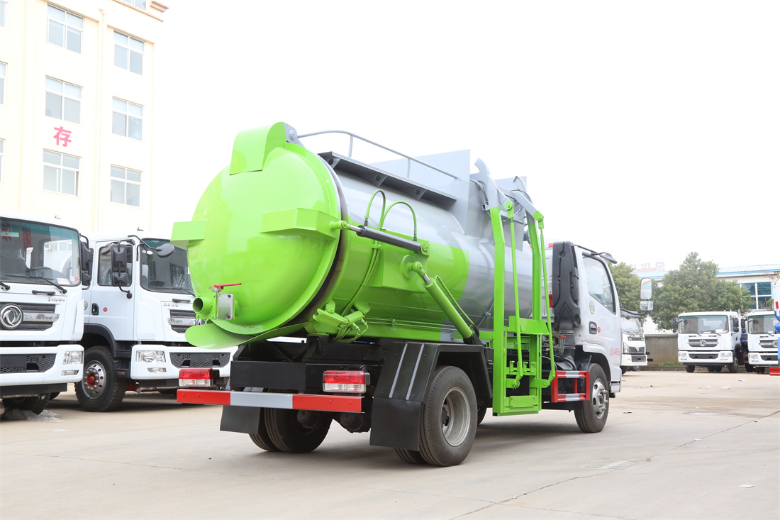 上裝配置:罐體容積6m3,配備120L/240L掛桶提升翻轉機構,液壓系統,后蓋液壓鎖緊開啟,罐體可以舉升自卸,尾部帶自流閥;用于運輸液態垃圾,其特點操作簡單,密封性好,無泄漏,無異味;可選裝固液分離功能,推板擠壓功能,常用于餐館的垃圾轉運處理。