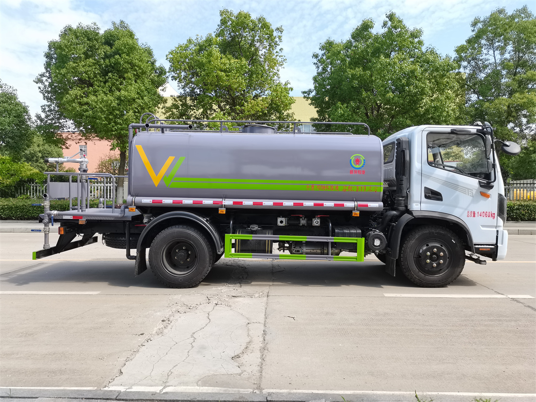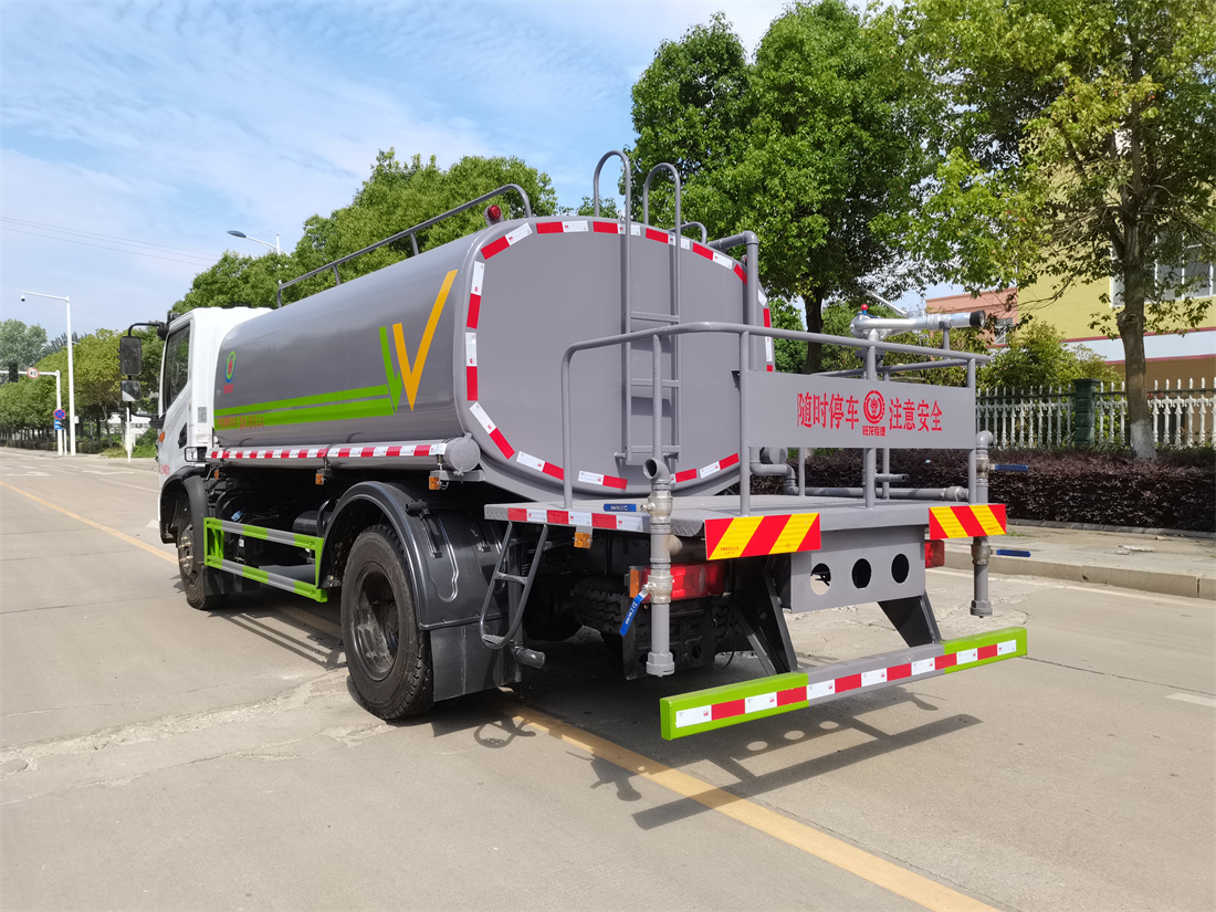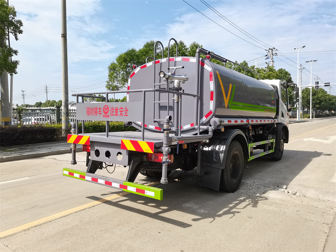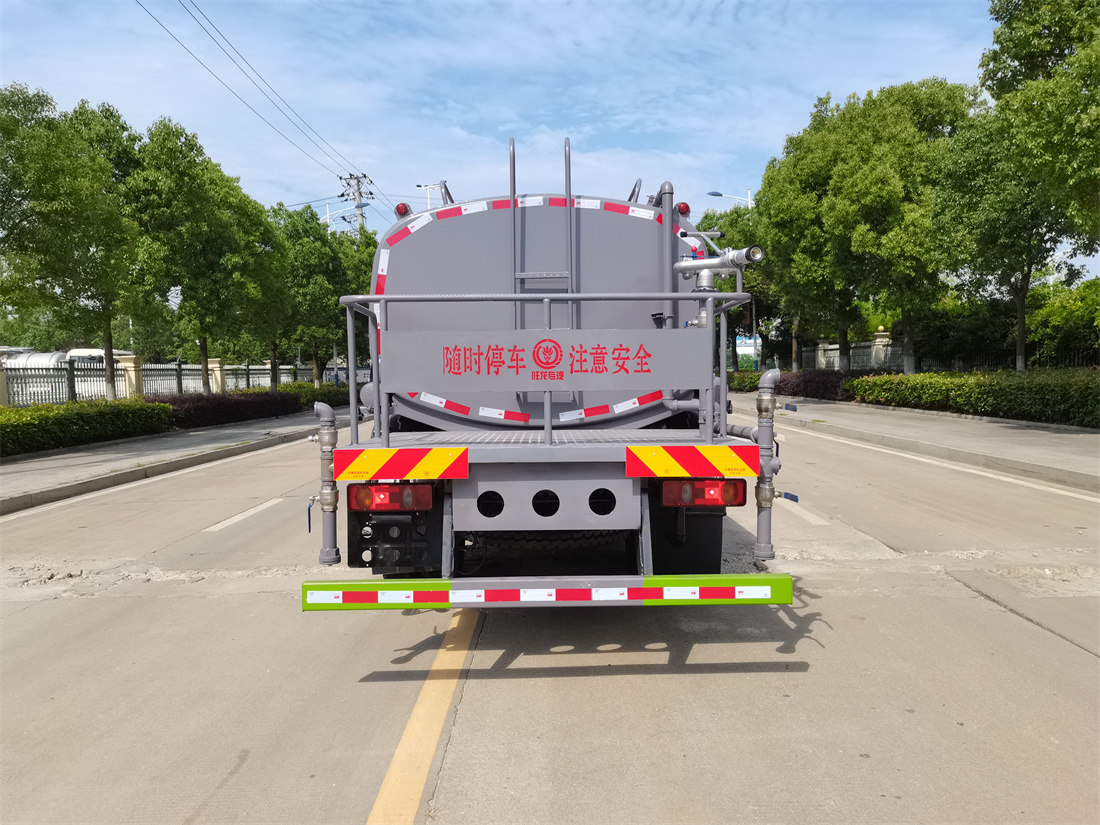 灑水車前裝有鴨形噴嘴或圓頭沖嘴,后面裝有圓柱開灑水噴嘴或蓮蓬頭噴嘴,后部有一工作平臺,裝配有水炮。后部還可裝8個噴嘴(選裝)。