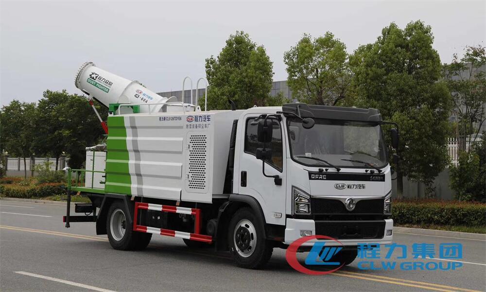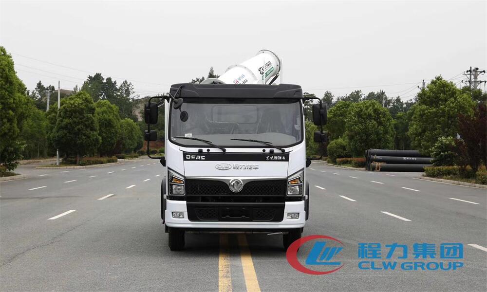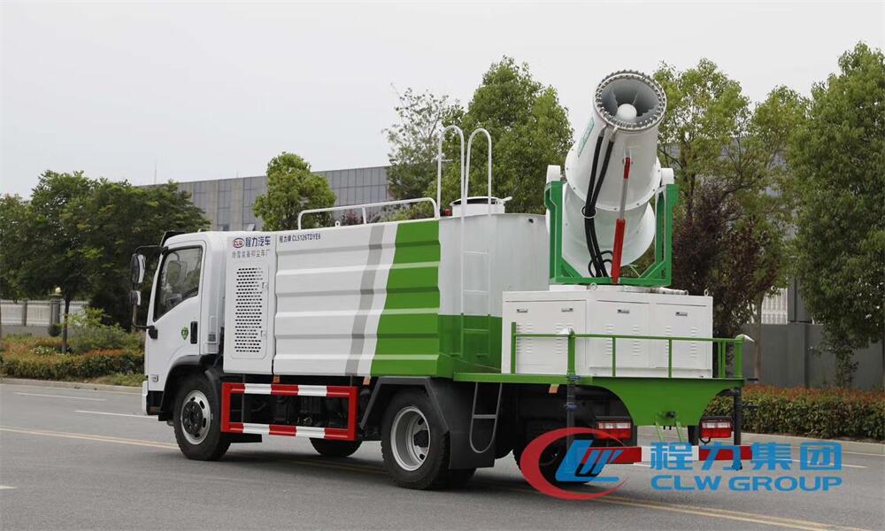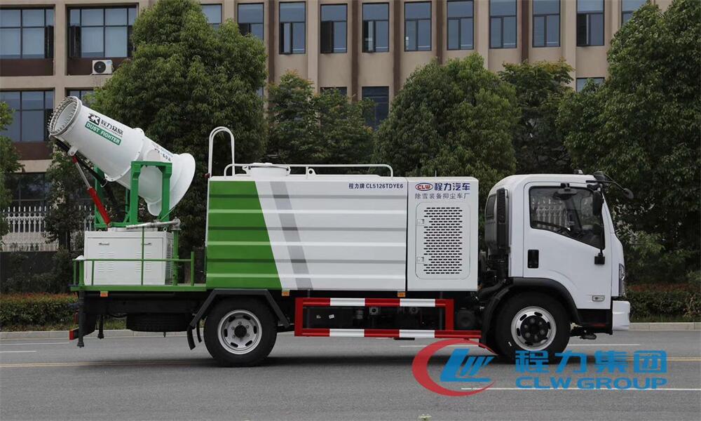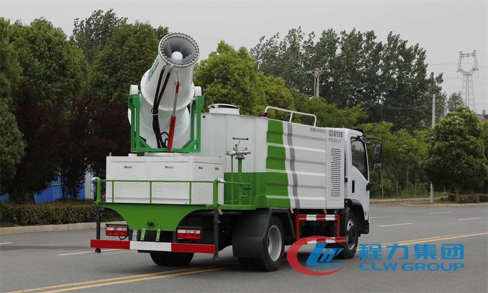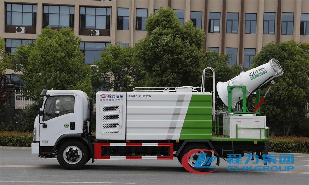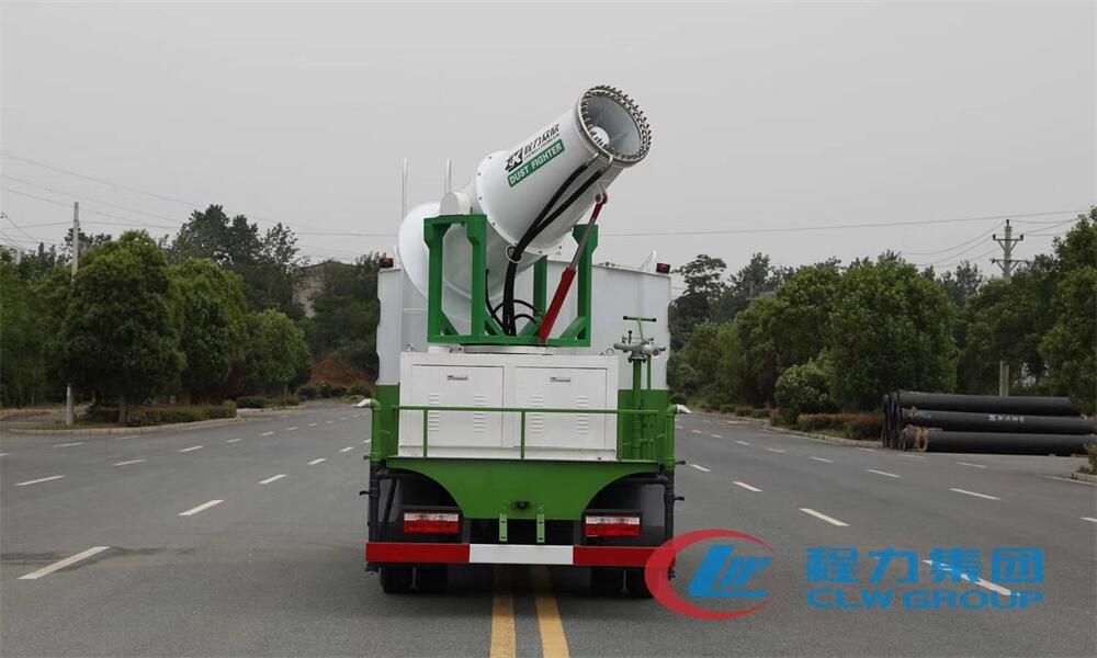 上裝配置:罐體容積為 8立方,選配風送式霧炮機組射程30米、40米、50米、60米、80米、100米、120米霧炮,罐體鋼板為4mm碳鋼Q235材質,罐內隔板具有防波作用,以減輕汽車行駛時罐體液體沖擊,罐體及整車外形尺寸按照公告。帶大功率專用灑水泵,泵可自吸自排,整車前沖、后灑、側噴、帶65消防接口,后平臺配CLW-50、CLW-60、CLW-80、CLW-100、CLW-120型風送式霧炮機組;罐體前封頭配大功率柴油發電機組;前封頭帶水位計,后平臺主管路帶1寸澆花接口,后爬梯。帶兩根輸水管及陰陽端。罐體顏色:銀/灰/綠,罐體兩側噴“多功能抑塵車”字樣,貼反光標示。