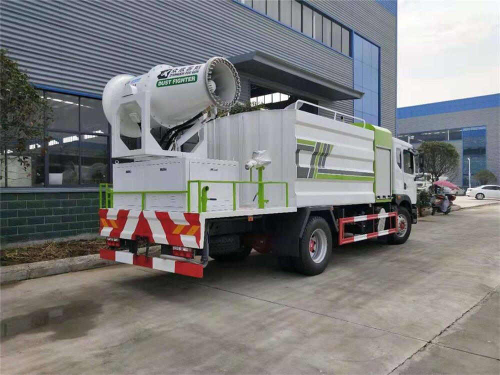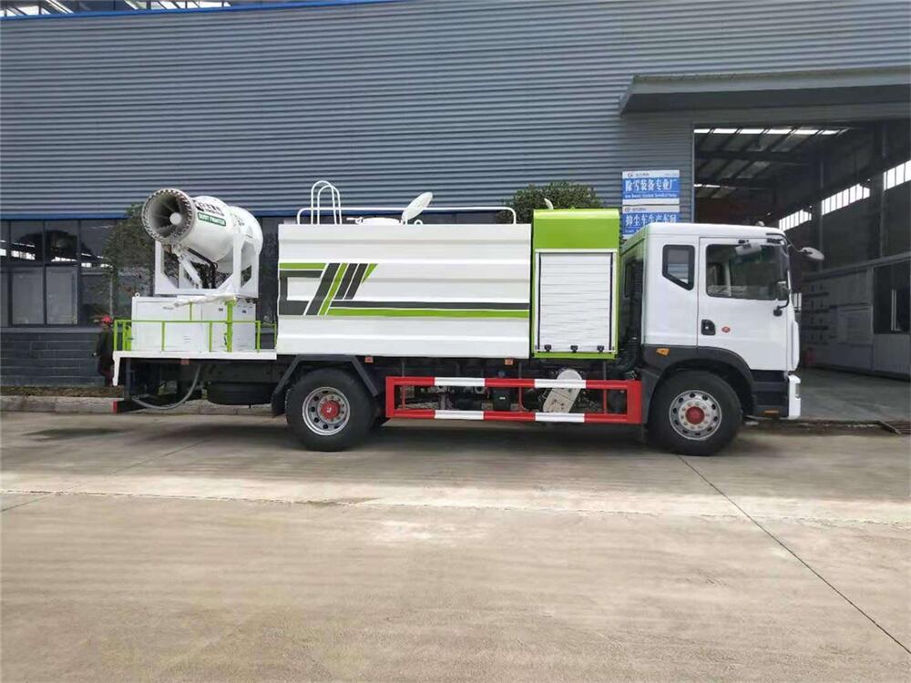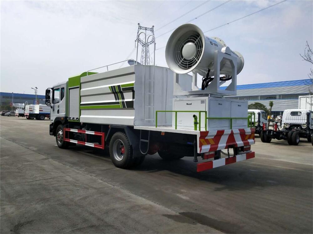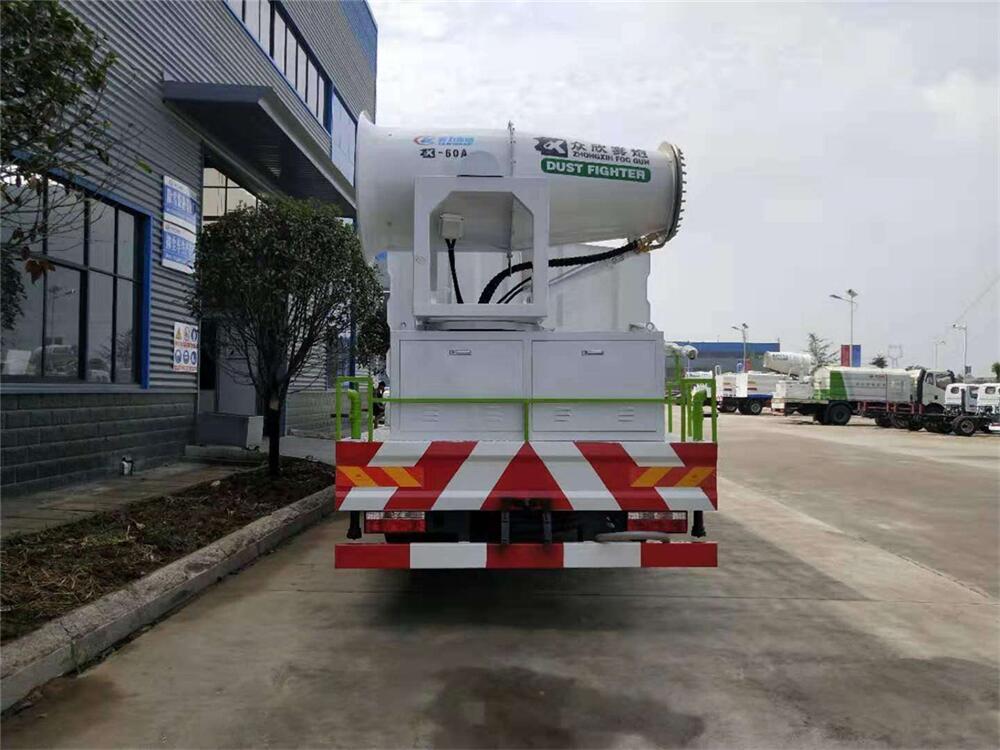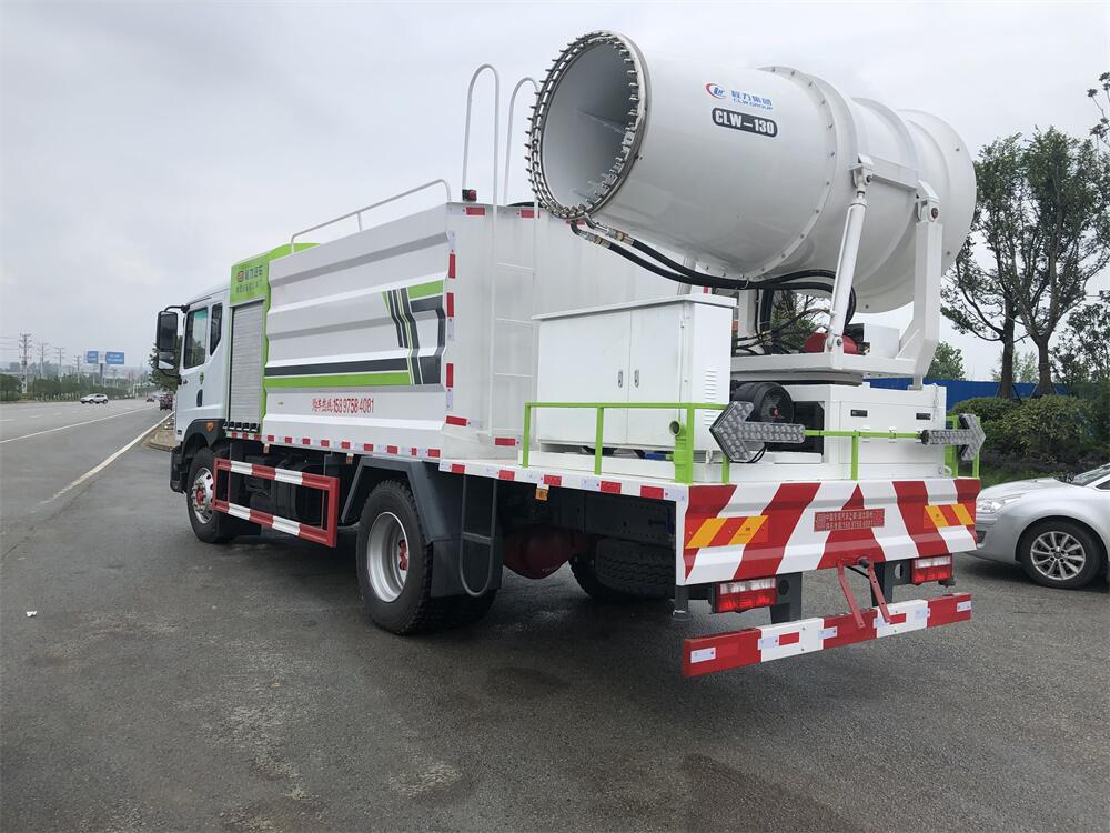 上裝配置:罐體容積為 12立方,選配風送式霧炮機組射程30米、40米、50米、60米、80米、100米、120米霧炮,罐體鋼板為4mm碳鋼Q235材質(zhì),罐內(nèi)隔板具有防波作用,以減輕汽車行駛時罐體液體沖擊,罐體及整車外形尺寸按照公告。帶大功率專用灑水泵,泵可自吸自排,整車前沖、后灑、側噴、帶65消防接口,后平臺配CLW-50、CLW-60、CLW-80、CLW-100、CLW-120型風送式霧炮機組;罐體前封頭配大功率柴油發(fā)電機組;前封頭帶水位計,后平臺主管路帶1寸澆花接口,后爬梯。帶兩根輸水管及陰陽端。罐體顏色:銀/灰/綠,罐體兩側噴“多功能抑塵車”字樣,貼反光標示。