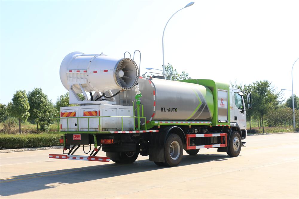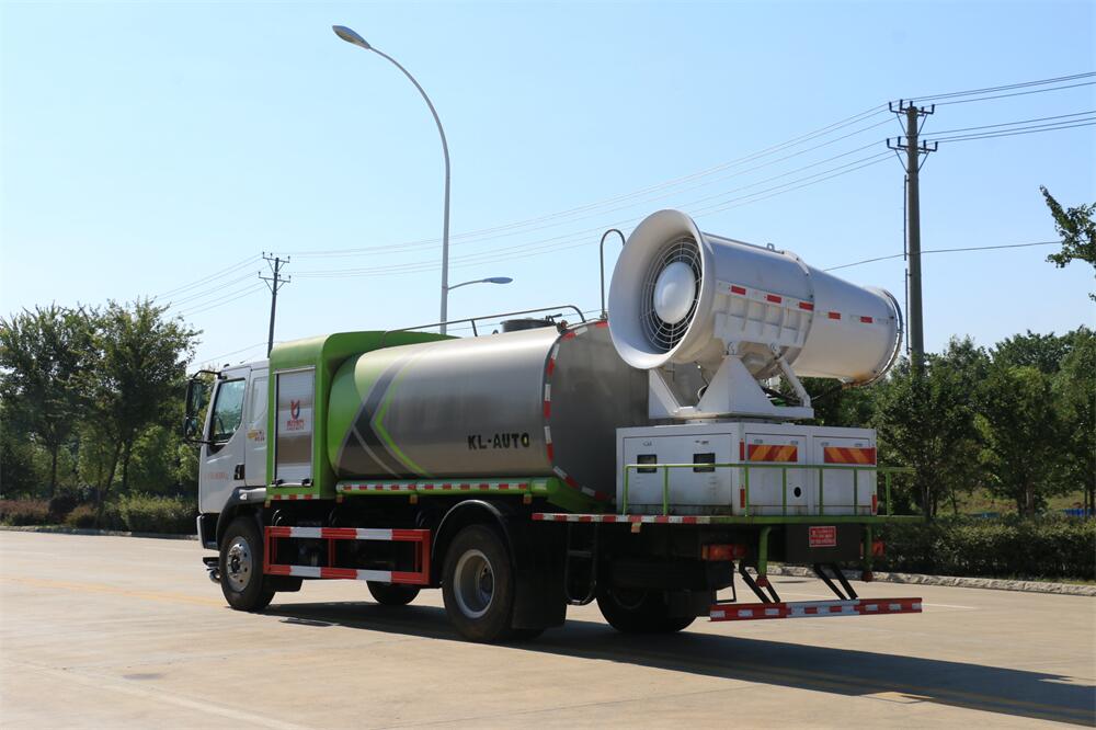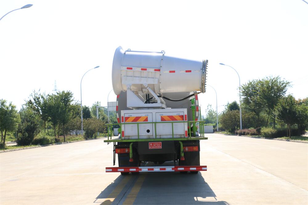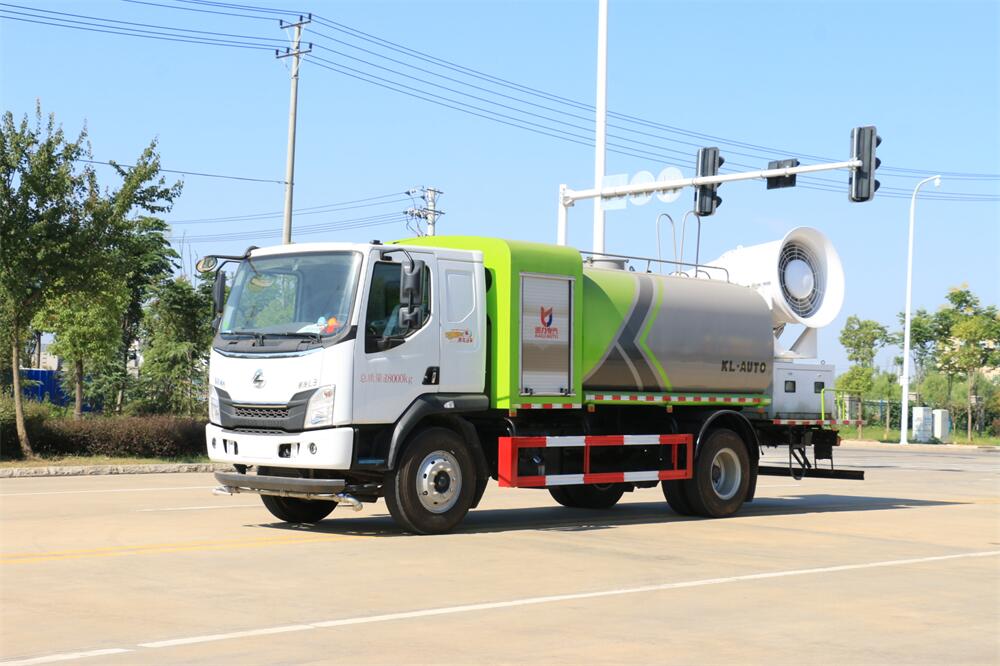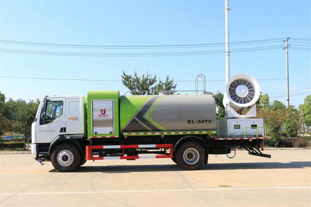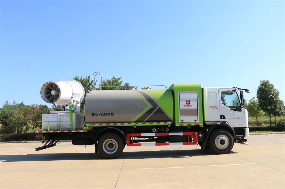上裝配置:罐體容積為 12立方,選配風(fēng)送式霧炮機組射程30米、40米、50米、60米、80米、100米、120米霧炮,罐體鋼板為4mm碳鋼Q235材質(zhì),罐內(nèi)隔板具有防波作用,以減輕汽車行駛時罐體液體沖擊,罐體及整車外形尺寸按照公告。帶大功率專用灑水泵,泵可自吸自排,整車前沖、后灑、側(cè)噴、帶65消防接口,后平臺配CLW-50、CLW-60、CLW-80、CLW-100、CLW-120型風(fēng)送式霧炮機組;罐體前封頭配大功率柴油發(fā)電機組;前封頭帶水位計,后平臺主管路帶1寸澆花接口,后爬梯。帶兩根輸水管及陰陽端。罐體顏色:銀/灰/綠,罐體兩側(cè)噴“多功能抑塵車”字樣,貼反光標(biāo)示。