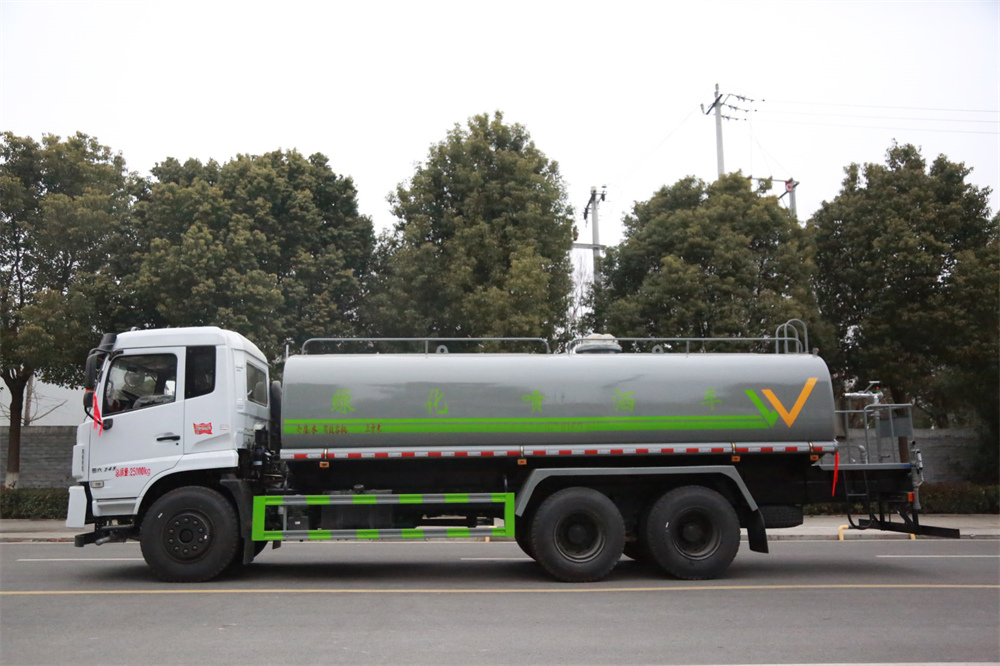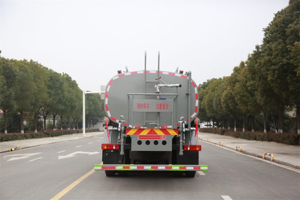 灑水車前裝有鴨形噴嘴或圓頭沖嘴,后面裝有圓柱開灑水噴嘴或蓮蓬頭噴嘴,后部有一工作平臺(tái),裝配有水炮。后部還可裝8個(gè)噴嘴(選裝)。